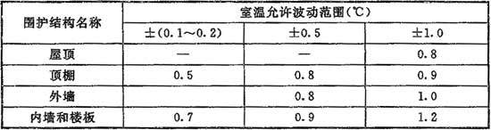 8.1.8 工藝性空氣調節區,當室溫允許波動范圍小于或等于±0.5℃時,其圍護結構的熱惰性指標D值不應小于表8.1.8的規定。